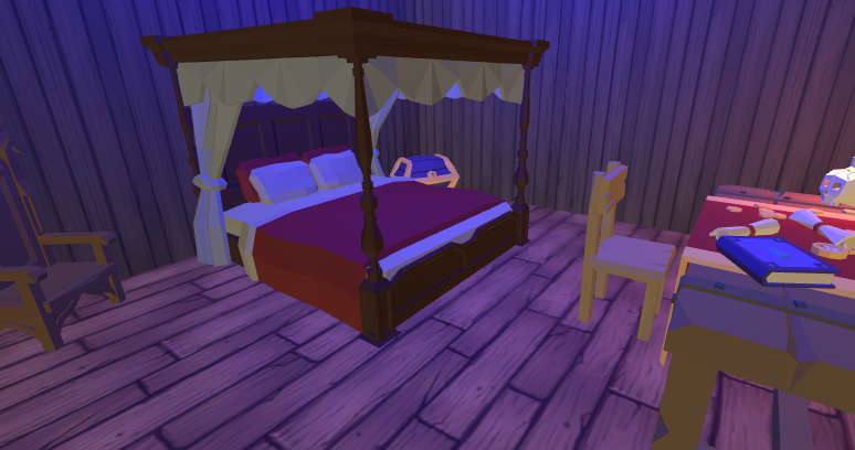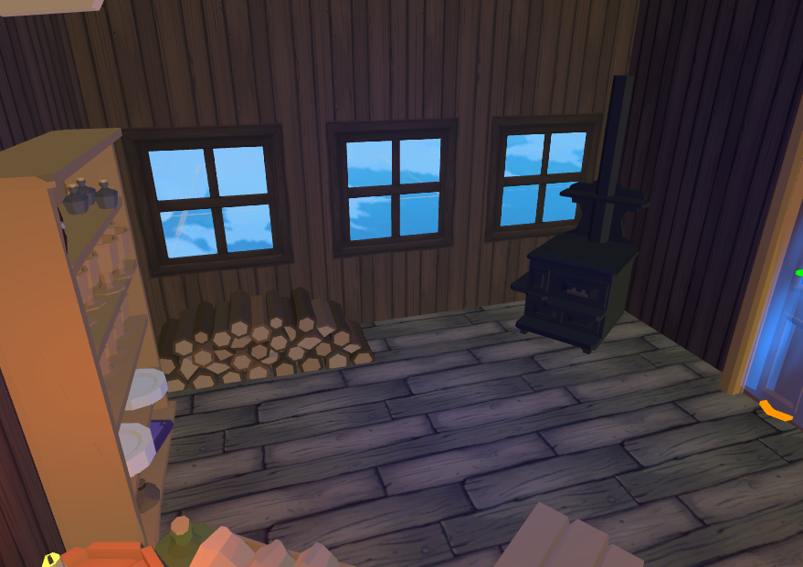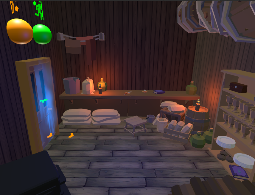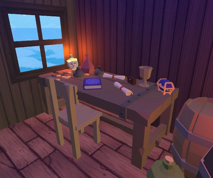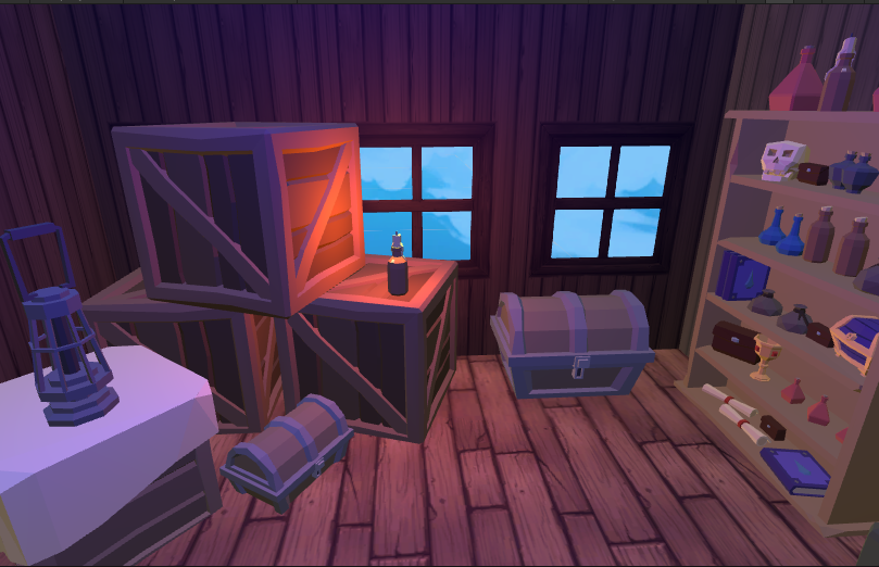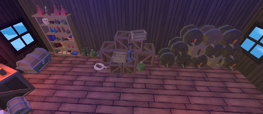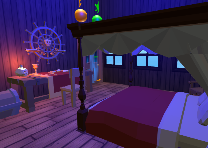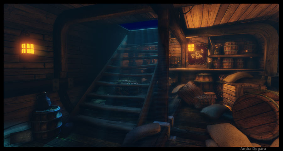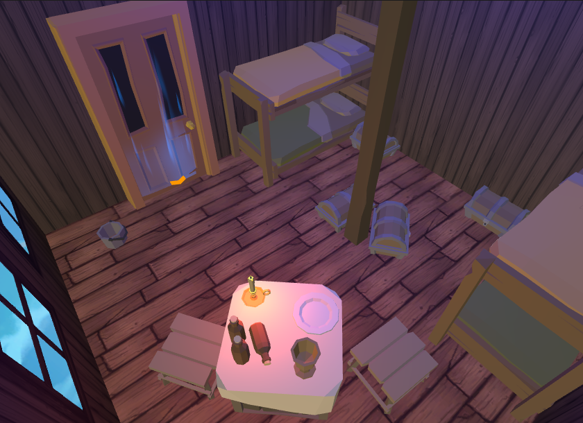 Since this environment is closed and very poor illuminated it was used a blue light to give the illusion of it. To keep the illusion of being inside a pirate ship, the windows where positioned in the opposite side of the kitchen, this way preventing that the player could observe any movement from other players inside it.