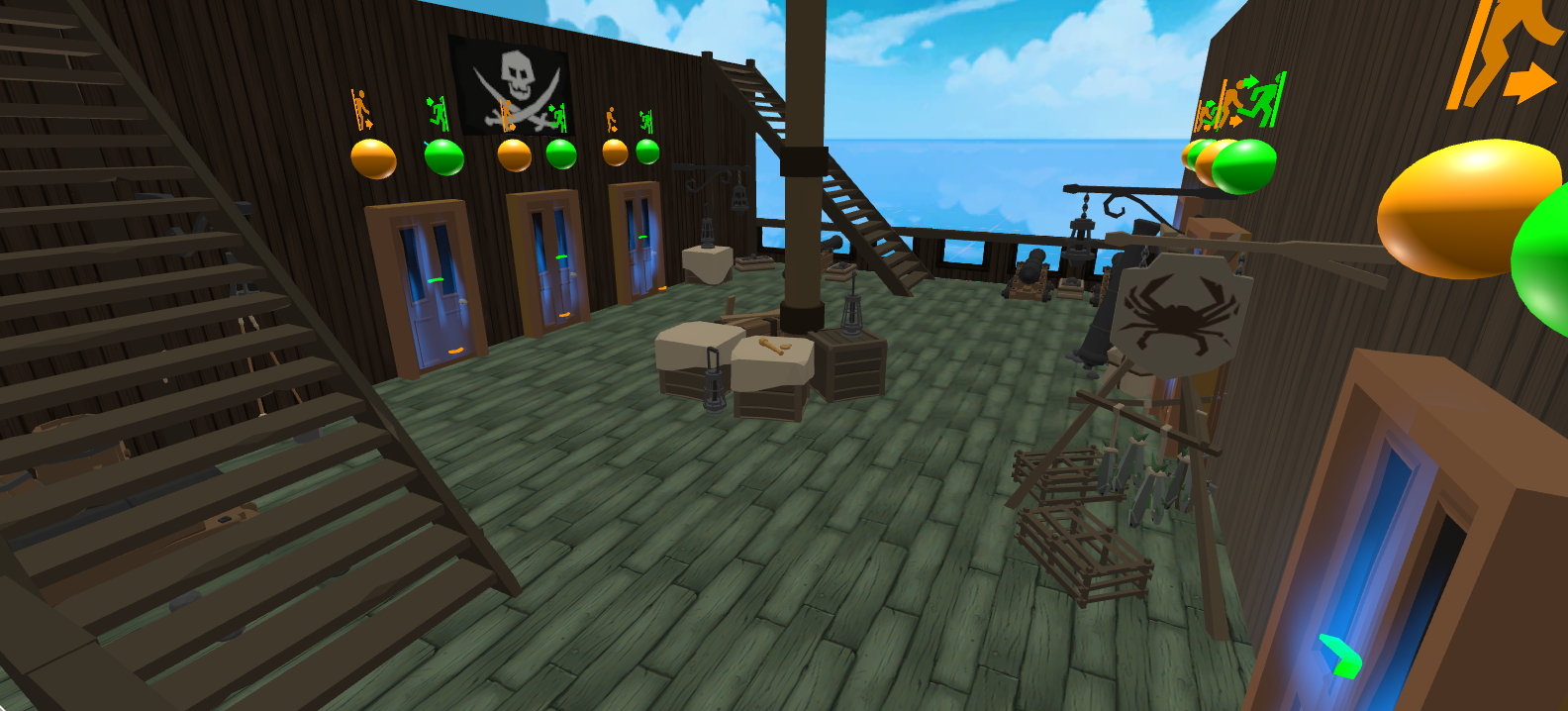 The map follows the shape of a ship and there’s both interior and external areas for the players to explore and was used photos from real pirate ships and other games. The windows inside the ship and the railing from the main deck are positioned in a way that guarantee that the players would never see inside other areas from the game and would have the immersion and illusion broken.