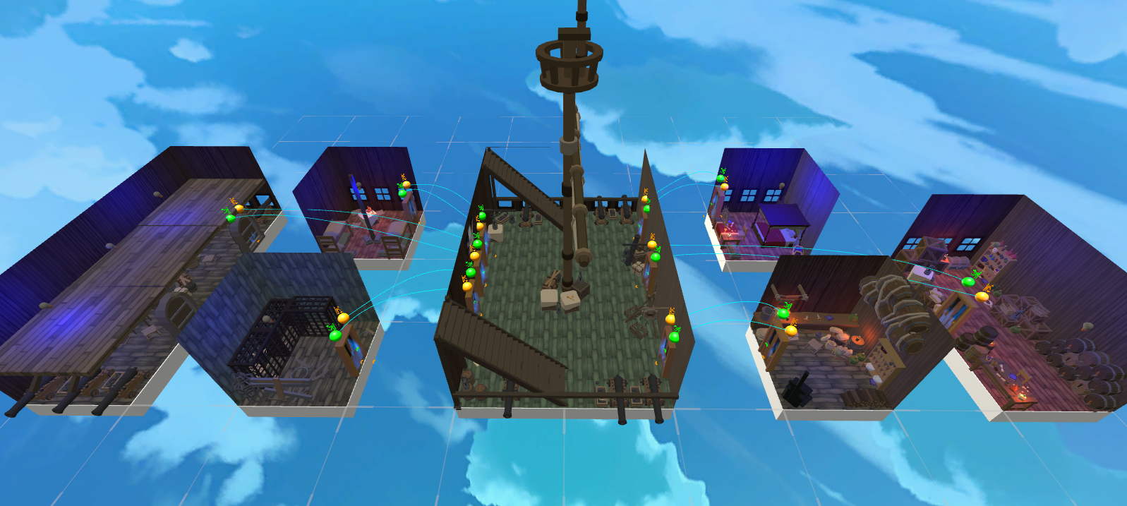 The main deck is the heart of the ship, is compose by 6 SETs in a 2x3 grid in the middle of the map. Its a rich environment with various props for players act with and is the main hub for all the other SETs. From here the players can quick move between SETs to explore the other areas.