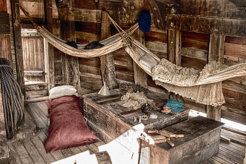 In contrast with the opulent captain’s quarter, the crew’s quarters are humble with bunk beds, smaller chests and a messy table with wine bottles. Its based on real life examples like the photo from Constantine Gregory from the Plimoth Mayflower Sleeping Quarters: