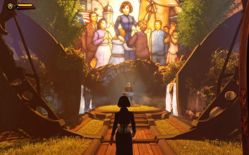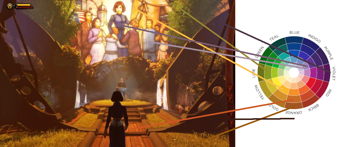 This seems a space where a player can take a pause, welcoming with the yellow and oranges. The purple being used on the woman on the center highlights her presence as being “above” the others, the glass. Its sacred and the player is being welcomed to take a deep breath before the action. Her head is even highlighted as sacred with light yellow forming a halo around it.