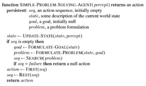 O processo de formulação de problema é o processo de decisão quais ações devem ser consideradas dado um objetivo. Já o processo da busca de sequência de ações que devem ser tomadas é chamado de busca. Há duas definições de algoritmos de busca:
