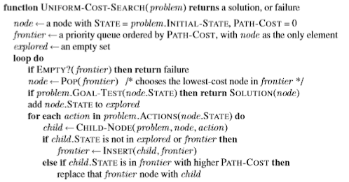 Quando todos os custos das ações são iguais, então o algoritmo de busca em largura é ótimo já que sempre alcança o nó mais raso da árvore. Com uma simples expansão é possível sempre encontrar o melhor caminho independente de qual é a função custo utilizada. Ao invés de expandir o nó mais raso, a busca uniforme busca expandir o nó n que tenha o menor custo de caminho dado pela função custo g(n). Isso é feito utilizando uma fila de prioridade ordenada por g.