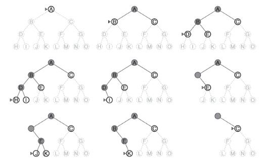 - Otimização: Independente da versão utilizada, ambas as versões são não ótimas. Considerando a árvore de busca apresentada, se o nó objetivo fosse o J ou o C, a busca em profundidade iria encontrar o nó J primeiro antes de encontrar o nó C. Portanto, a busca em profundidade não é ótima