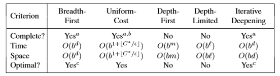 A tabela a seguir mostra a comparação entre os métodos de busca apresentados utilizando a abordagem utilizando árvores. Para buscas utilizando grafos a principal diferença é que o método de busca em profundidade é completo se for considerado um espaço de busca finito e o espaço e o tempo necessários são proporcionais ao tamanho do espaço de busca. Observe que b é o coeficiente de ramificação da árvore utilizada; d é o nível mais raso em que a solução se encontra; m indica a profundidade máxima da busca; l indica o limite de profundidade; O sobrescrito a indica é completo apenas se o espaço de busca for finito; b completo se o custo do passo for para um positivo ; c ótimo se o custo dos passos forem idênticos;