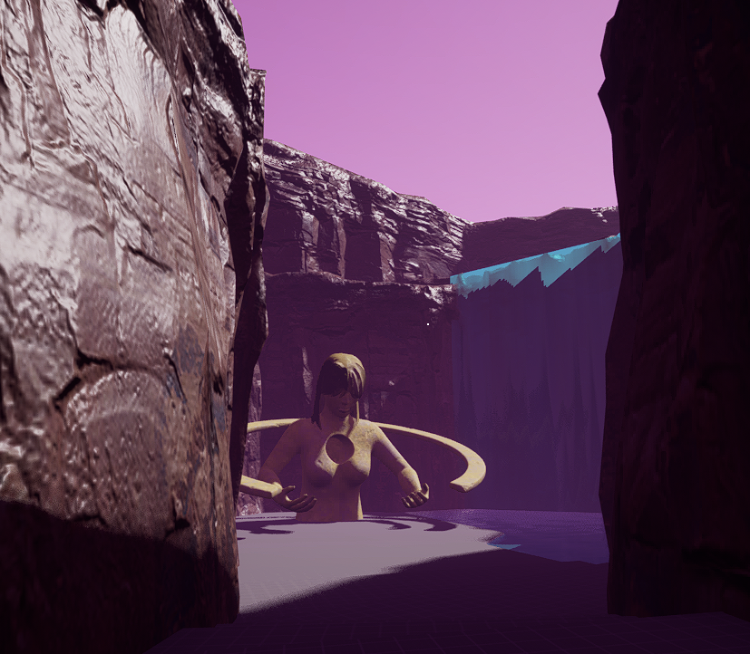 “Tracing a path through the canyon, Edmund appears multiple times, overcome with doubt, begging the Dreamwalker to stop, as they force him to move forwards. The temple rises out of the water at the canyon’s end, taking the shape of a woman with an unreadable expression.”