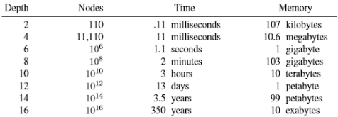 Uma complexidade exponencial é bastante assustadora. Na tabela a seguir vemos o crescimento do uso de memória e tempo para diversos valores de d utilizando um valor de b=10. Nessa tabela assume-se que 1 milhão de estados podem ser gerados por segundo e que cada nó requer 1000 bytes de espaço.