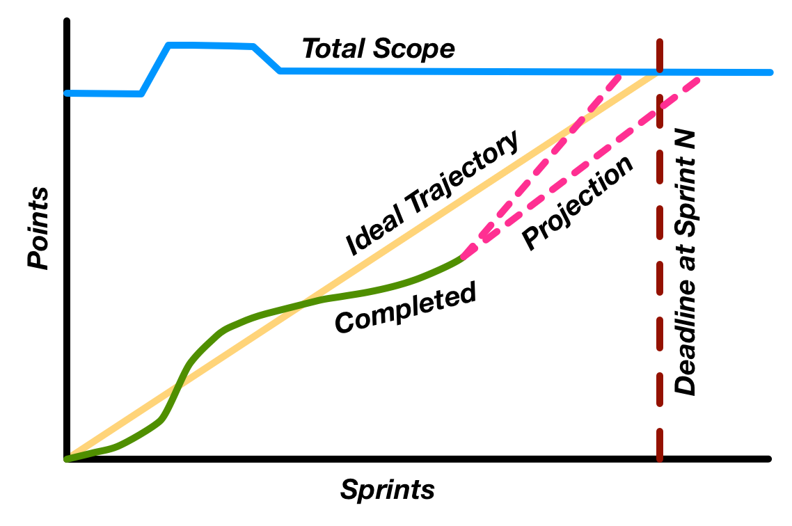 A burn up chart is diagram made considering the complete work. Has the same content as a burn-down chart, but has the opposite appearance because it “flips the variable”.